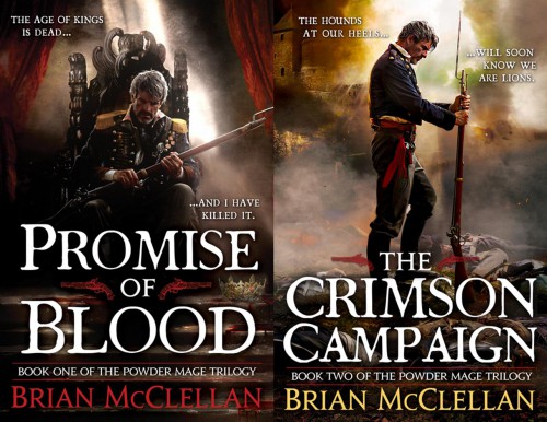 The third and final (?) novel in the Powder Mage series. I’ve thoroughly enjoyed the first two — Promise of Blood and The Crimson Campaign — and can’t wait to see how it shapes up. Here are the covers for the first two: